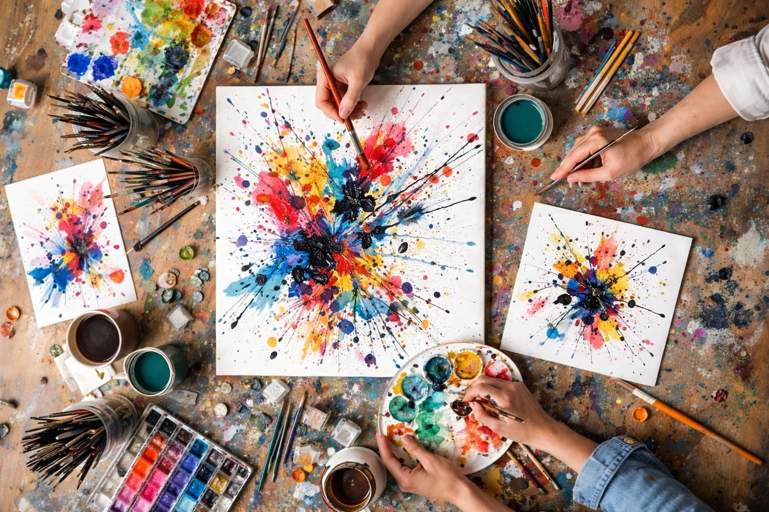 Freies, kraftvolles Malen. Farben werden geschüttet, gespritzt oder gependelt, ideal zum Loslassen, Stressabbau oder für kreative Gruppen- oder Team-Events. Wir zeigen dir Schritt für Schritt wies geht.